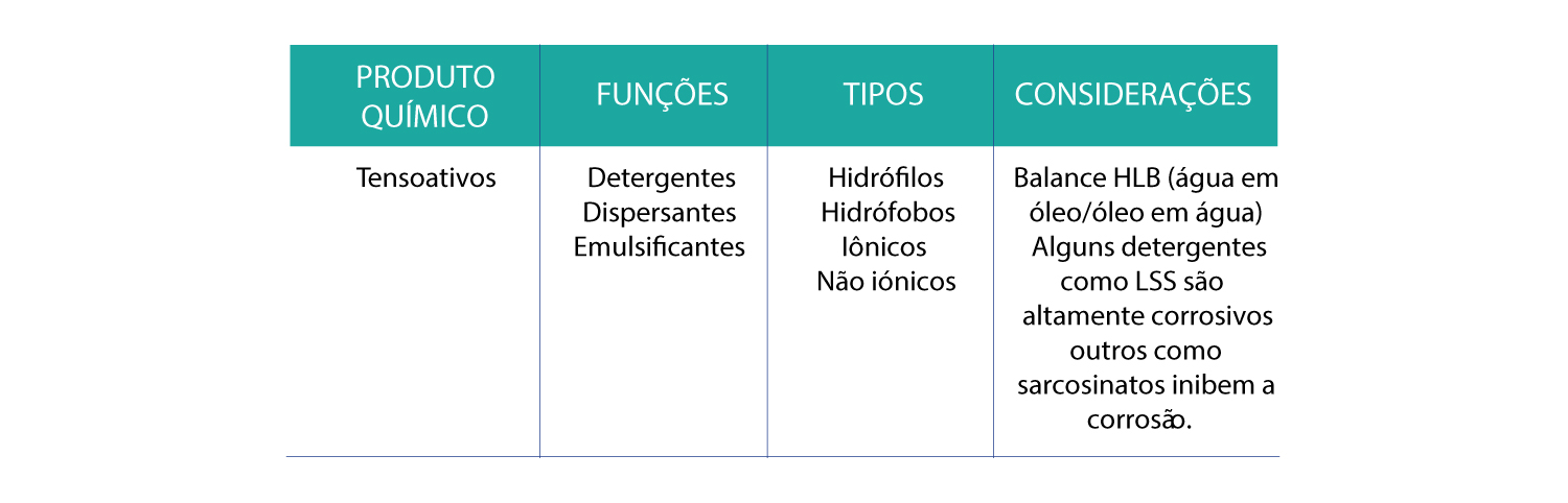 2.1 Base água: tensoativos, solventes em pequenas quantidades, anticorrosivos, aditivos solúveis em água, ceras, silicones, antiespumantes, bactericidas, partículas suspensas.