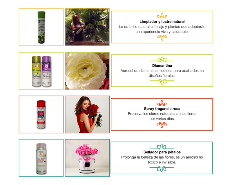 Productos en aerosol para aplicarlos directamente en las flores naturales. Su exigente y especial formulación, permite que las flores transpiren y no afecten su vida.