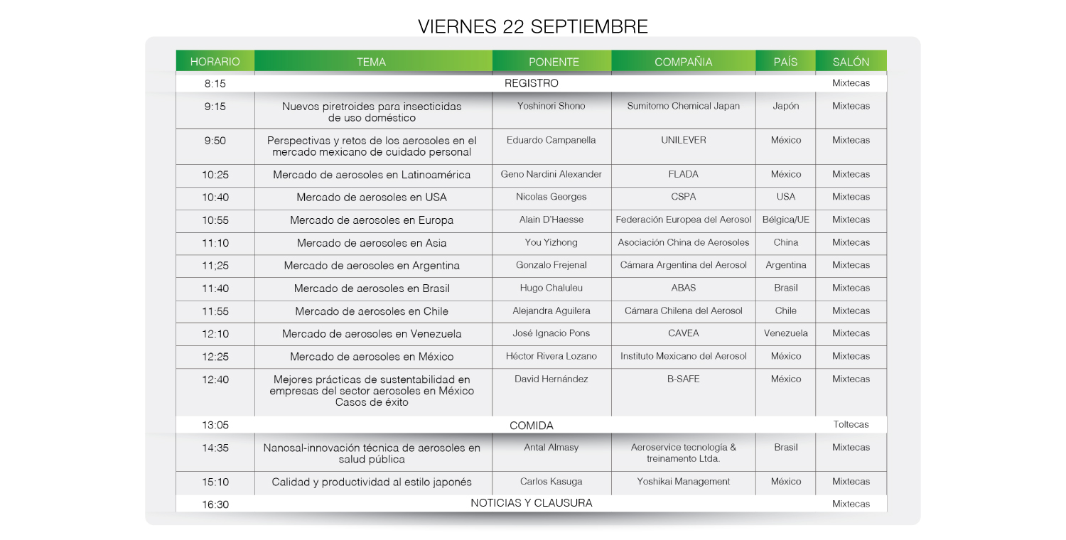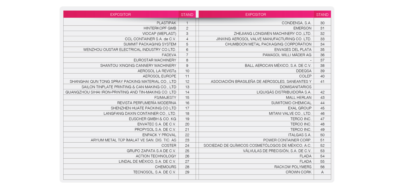 El momento ha llegado, estamos listos para recibir a los más de 1000 visitantes de todo el mundo. Estamos listos para ofrecerles la mejor hospitalidad, la mejor jornada de conferencias con los temas más relevantes en la industria del aerosol, impartidos por expertos y líderes en la materia. En este congreso estarán presentes las empresas especializadas en la producción de aerosoles a nivel mundial.