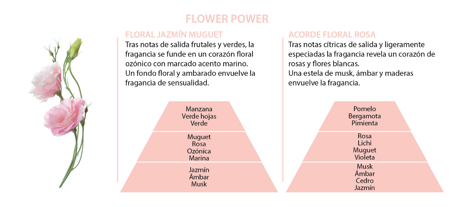 Florales, luminosos y frescos. Flores blancas frescas y transparentes. Fragancias que recrean un paseo por un jardín primaveral. Los clásicos florales jazmín, peonia y rosa se refrescan con toques verdes y herbales.