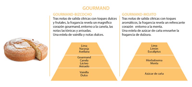 Fragancias inspiradas en postres, dulces, caramelos, azúcar, comida casera, fruta suculenta, licores, cócteles, vinos, whisky con notas gourmand de chocolate, algodón de azúcar, melocotón con champagne, incluso absenta para añadir un toque vintage.
