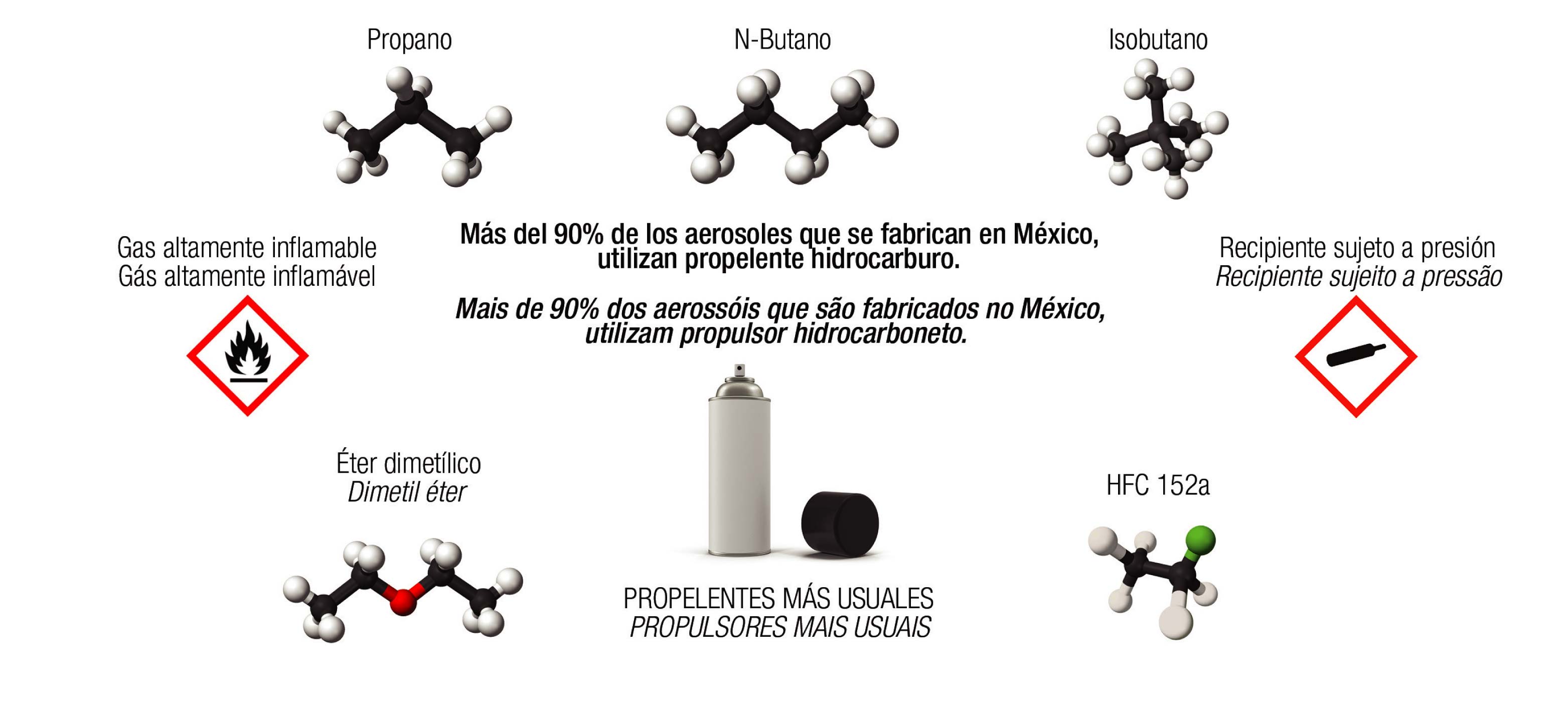 Mas del 90 por ciento de los aerosoles que se fabrican en México, utilizan propelente hidrocarburo; por este motivo las Naciones Unidas han clasificado los aerosoles como mercancías peligrosas.