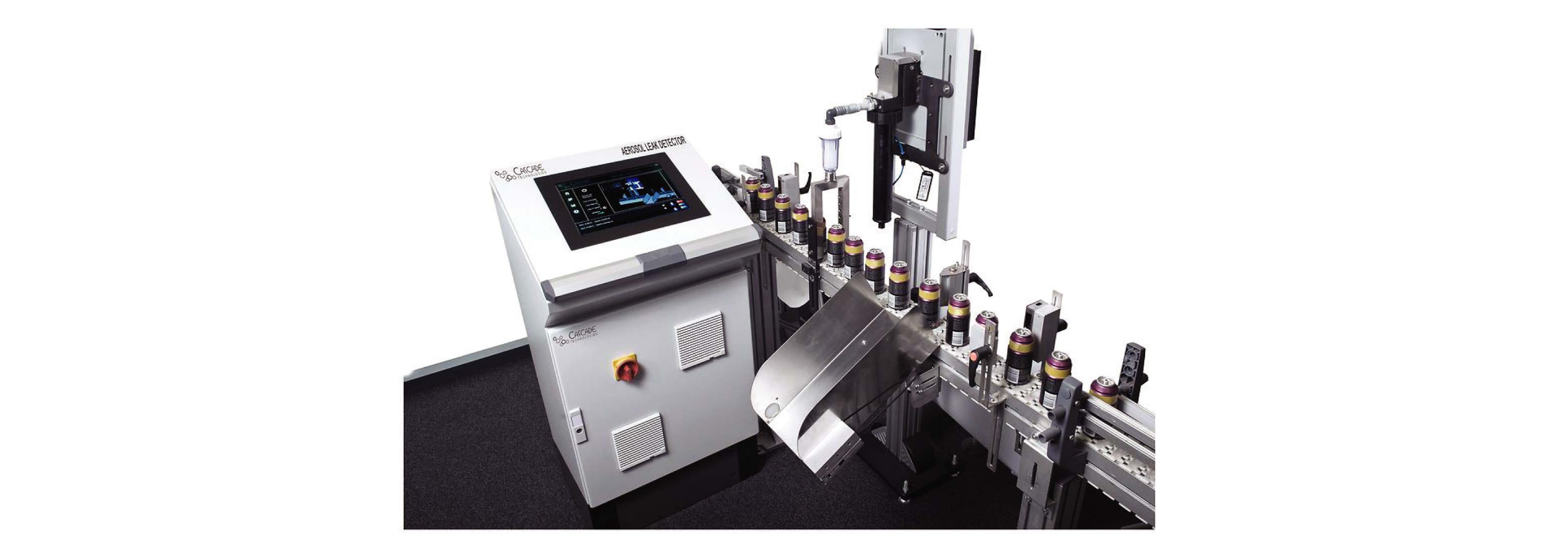 En este caso los aerosoles vienen en la cinta transportadora, pasan por un arco que emite unas hondas y detecta cualquier fuga mandando la señal al equipo y cuando el aerosol llega a la sección de rechazo, el bote se elimina.
