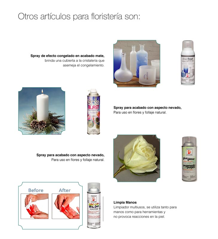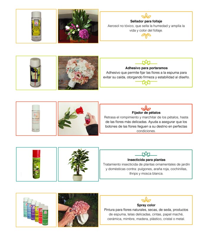 Productos en aerosol para aplicarlos directamente en las flores naturales. Su exigente y especial formulación, permite que las flores transpiren y no afecten su vida.