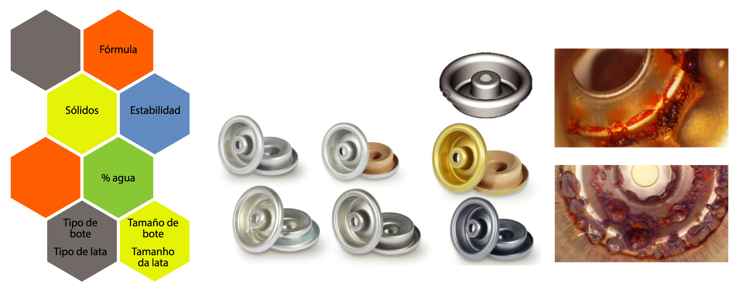O casquilho é o que ocupa mais espaço, mais área e contato com o produto. Se decidimos utilizar água e um casquilho regular de folha de flandres sem revestimento, vai oxidar, então necessitamos considerar a fórmula, se temos sólidos ou não. É importante mencioná-lo porque existem produtos ou sólidos que têm estática e existem revestimentos que podem ser incompatíveis, por isso tem que cuidar se têm sólido e a estabilidade. É de extrema importância que quem vá criar um novo aerossol faça prova de estabilidade e veja o que passa a médio e longo prazo. A porcentagem de água, o tipo e tamanho da lata.