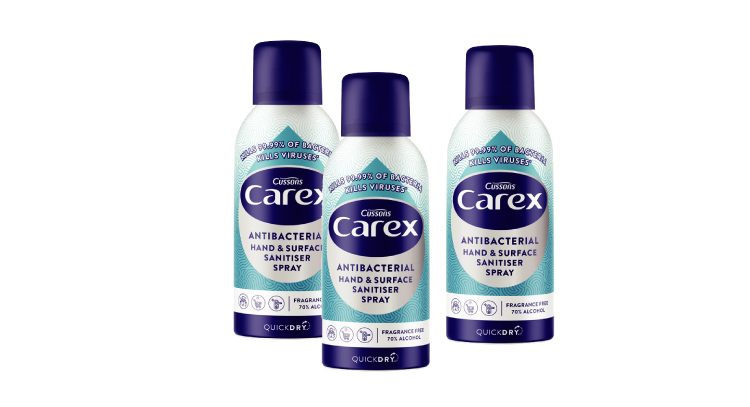 Carex lanzó una gama de nuevos productos de higiene, que incluye un aerosol desinfectante a base de alcohol que puede usarse en las manos y superficies. Este aerosol a base de alcohol, dos en uno, se comercializa como una forma conveniente de mantener las cosas higiénicas. Tiene un 70% de etanol como ingrediente activo, que debe ser eficaz para matar gérmenes, incluidos virus envueltos como el coronavirus, en manos y superficies