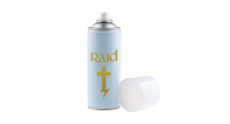Promocionando el nuevo producto como una forma más compasiva de acabar con la vida de las plagas domésticas comunes, Raid introdujo un aerosol con infusión de agua bendita que permite que las cucarachas se bauticen y mueran como cristianas. Fisk Johnson, director ejecutivo de la empresa matriz de Raid, SC Johnson, explicó que ellos saben lo importante que es eliminar las cucarachas, polillas, arañas y otros insectos del hogar, y ahora puede hacer sin condenar sus almas en el infierno por toda la eternidad.