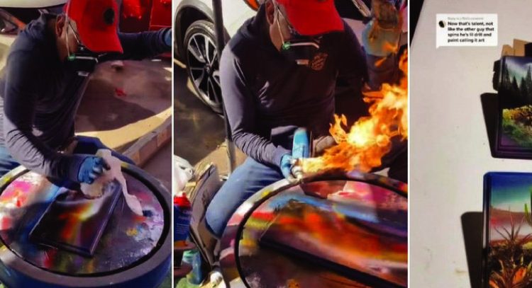 El artista realiza trazos con diferentes colores de aerosol sobre un cuadro de madera rectangular, que se encuentra sobre una plataforma circular y que el hombre gira cada que hace un rocío el aerosol. El resultado final es simplemente impresionante, y de esta manera el hombre demuestra que con pocos y económicos materiales es posible crear increíbles obras de arte.