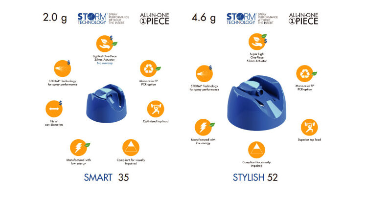Los primeros actuadores impulsados por la revolucionaria tecnología STORM®, que elimina la necesidad del inserto y mantiene una excelente calidad de rociado, SMART 35 y STYLISH 52 también se benefician de diseños radicales: de una sola pieza, sin inserto, extremadamente livianos y sin sobretapa. Esta nueva generación de actuadores de PRECISION ofrece a las capas de la industria de aerosoles una solución innovadora a la pregunta cada vez más compleja: “¿cómo generar ahorros mejorando la sustentabilidad?”.