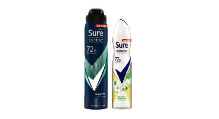 La marca de desodorantes Sure añadió dos nuevos aromas a su gama de aerosoles femeninos y masculinos existentes: Sure Nonstop Freesia & Waterlily y Sure Men Nonstop Sensitive. La adición de Sure Nonstop Protection Freesia & Waterlily aprovecha el 23 % de las mujeres que ven la fragancia como una consideración principal al elegir un antitranspirante. Con el 27 % de los compradores masculinos buscando productos que no irriten su piel, Sure Men Nonstop Protection Sensitive ofrece un desodorante para abordar este problema. Unilever señaló que la lata de antitranspirante está hecha con aluminio infinitamente reciclable y ensamblada en una fábrica que utiliza electricidad de la red renovable.