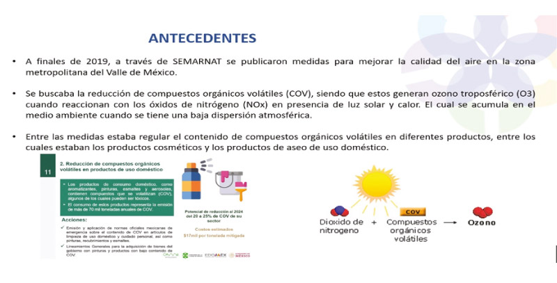 También estamos abordando el tema de los compuestos orgánicos volátiles. En México, la Secretaría de Economía nos ha incluido nuevamente en el listado de productos regulados, tanto en el sector de pinturas como en productos de acero y hogar. Esto incluye los desodorantes, un sector clave, cuyo porcentaje dentro del mercado es bastante relevante.