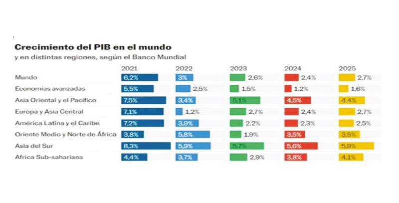 Podemos observar el crecimiento del Producto Interno Bruto a través de las distintas zonas geográficas de varias regiones. En nuestro caso, estamos en un 2.3, según un reporte del Banco Mundial. Esto es relevante para mí, ya que refleja también la situación económica y política de cada país.