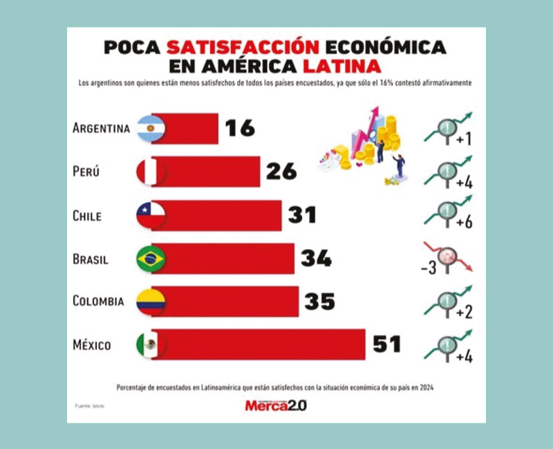 Esta es la inflación en Latinoamérica, que influye en el consumo. Argentina sigue teniendo un impacto considerable, mientras que Brasil, Chile, Colombia y Costa Rica también son relevantes. En esta gráfica se muestra la percepción de la satisfacción económica en la región, según cómo los ciudadanos perciben el crecimiento económico en sus países. Este informe ha sido emitido por los líderes de cada región.