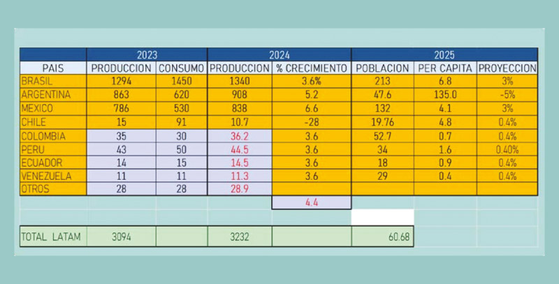 Perú presenta una producción de 44 millones, Ecuador 14 millones, Venezuela 11 millones, y otros países suman 29 millones. Sin embargo, el nicho de negocio y la oportunidad de integración de estos países es clave para fortalecer y mantener estos mercados. De cara al crecimiento en 2025, observamos que Brasil proyecta un aumento cercano al 3%, lo que refleja una tendencia positiva en la región.