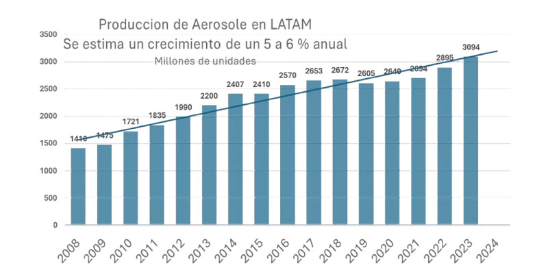 En 2024, la producción de aerosoles será la siguiente: Brasil con 1.340 millones de unidades, Argentina con 908 millones, México con 838 millones, y Chile ha disminuido a 10.7 millones. El último reporte de Colombia fue de 36.2 millones de unidades, aunque actualmente produce mucho más.
