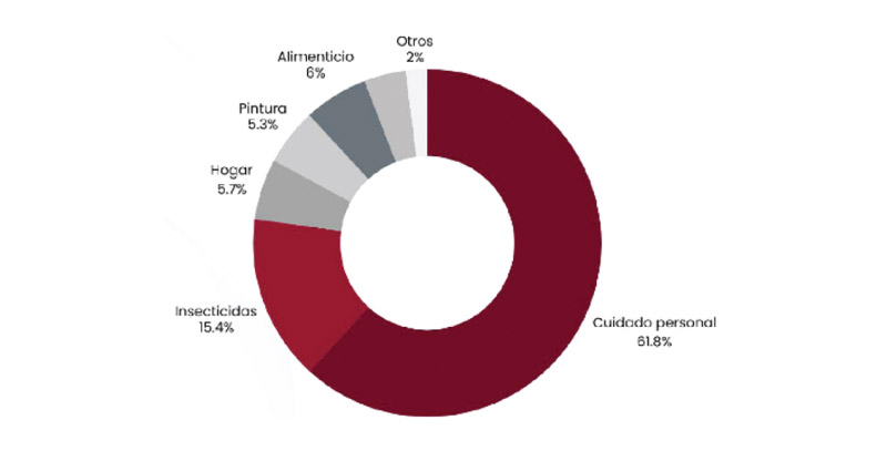 Los insecticidas representan 129,062,621 unidades (15.40%), un rubro históricamente sólido que se mantiene por la demanda constante en climas cálidos y zonas urbanas densas. A esto se suman los productos alimenticios (50,014,528 unidades; 5.97%), para el hogar (47,410,043; 5.66%), y pinturas (44,322,340; 5.29%), cada uno con características de crecimiento específicas y orientadas tanto al mercado doméstico como al industrial.